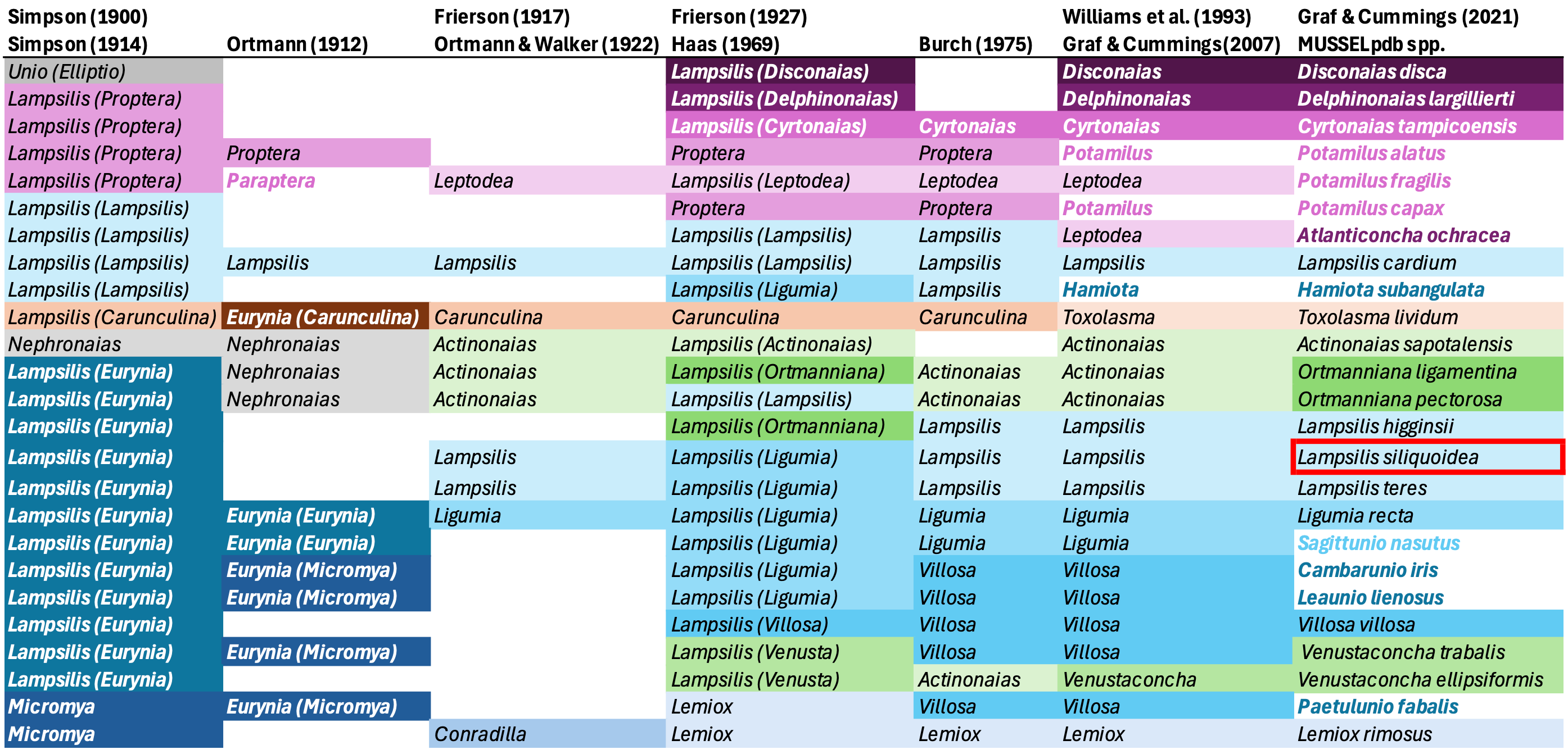 Graf, D.L. & K.S. Cummings. 2021. A ‘big data’ approach to global freshwater mussel diversity (Bivalvia: Unionoida), with an updated checklist of genera and species. Journal of Molluscan Studies 87(1): eyaa034 (36 pp.).