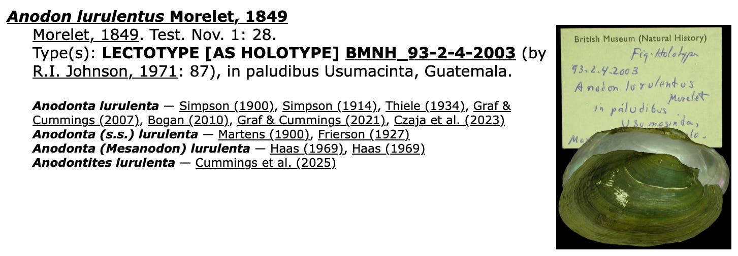The reclassification of Anodontites lurulenta was just one of the revisions we made in our new book, Freshwater Mussels of Central America, published in September by Routledge (Cummings et al., 2025). Though a few species and genera were resurrected from the purgatory of synonymy, many more were sunk into invalidity for a net loss of almost 30 species! The hotspot of Central American freshwater mussel diversity got a little bit cooler.